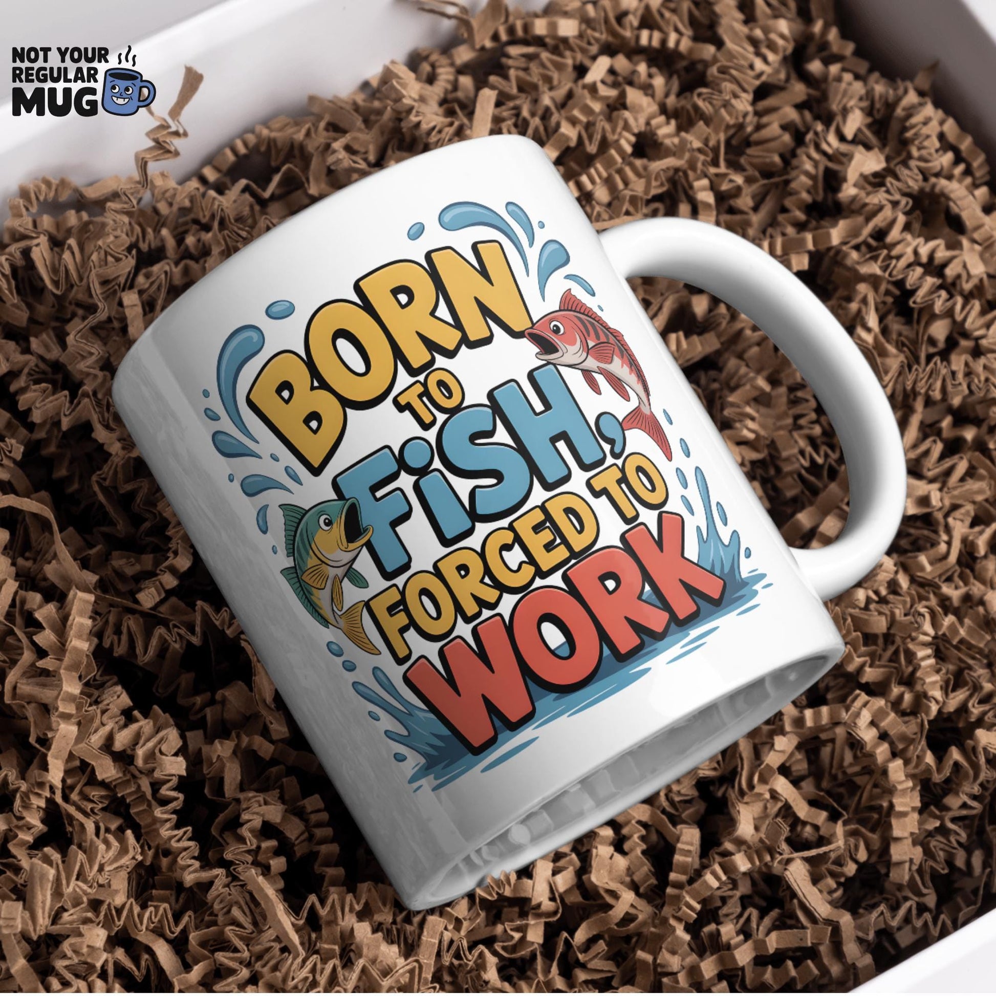 • Funny fishing mug with “Born To Fish, Forced To Work” slogan