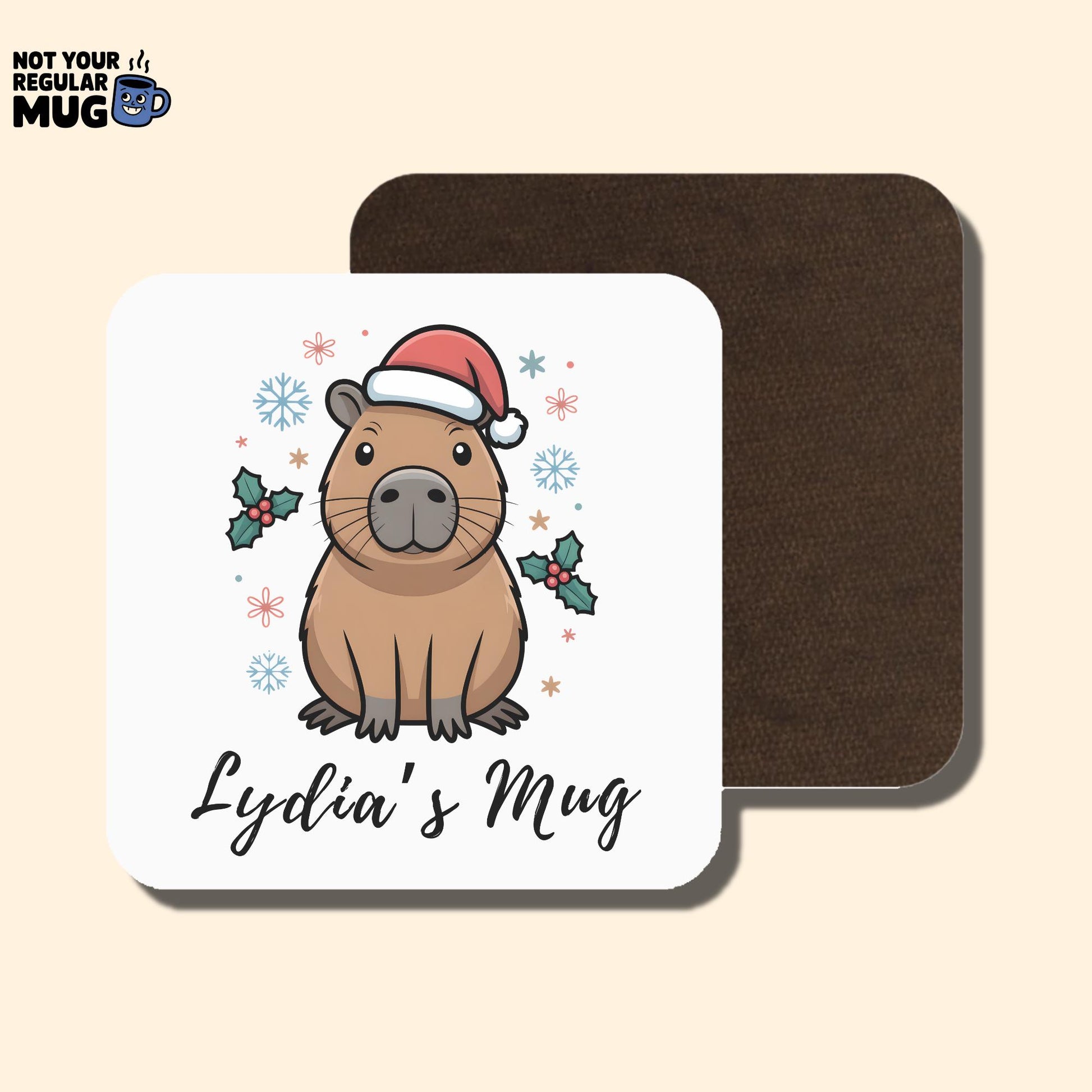 Celebrate the festive season with this adorable personalised Christmas capybara mug. Featuring a cute capybara wearing a Santa hat with snowflakes and holly details, this mug makes a fun and cosy Christmas gift for animal lovers of all ages.