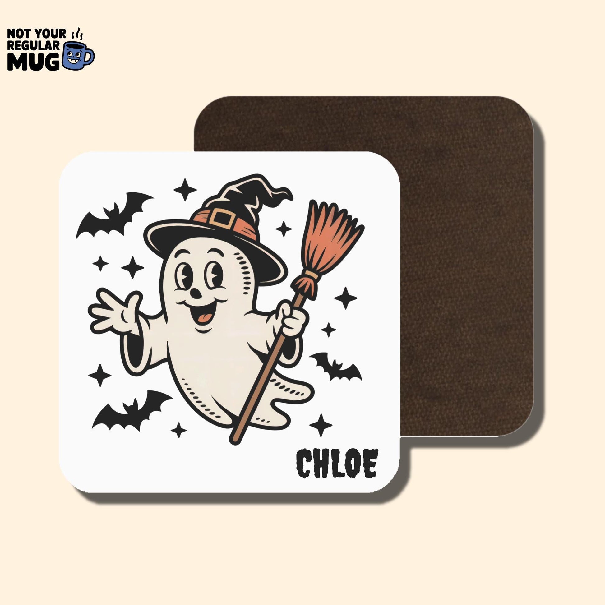 For lovers of spooky season with a retro twist. This personalised vintage ghost mug features a cute retro-style ghost wearing a witch hat and holding a broom, finished with a custom name for a nostalgic Halloween feel.