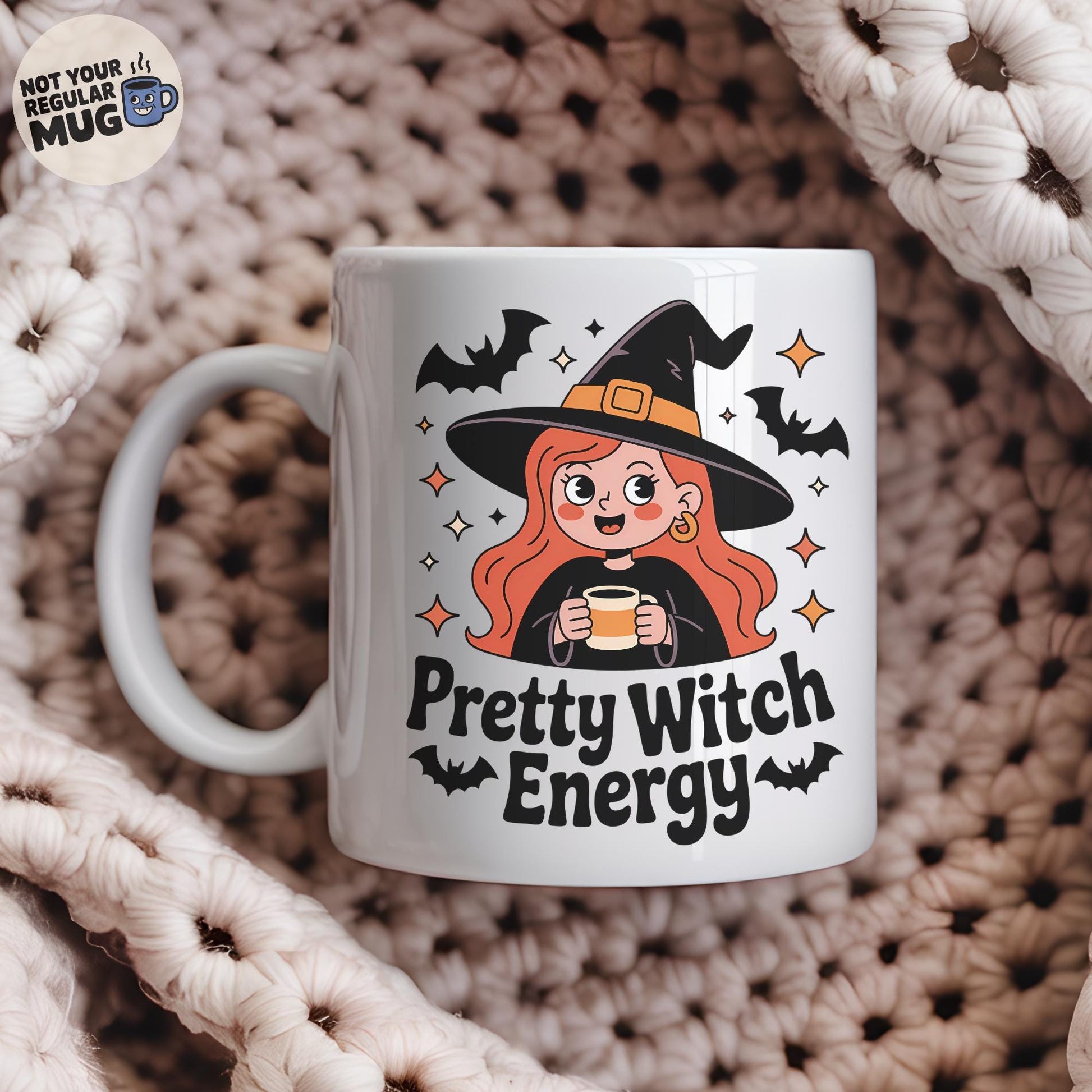 Sip your potion in style with this “Pretty Witch Energy” Halloween mug. Featuring a cute cartoon redhead witch with spooky bats and cosy fall vibes, it’s made for witches who like their coffee with a side of sass.