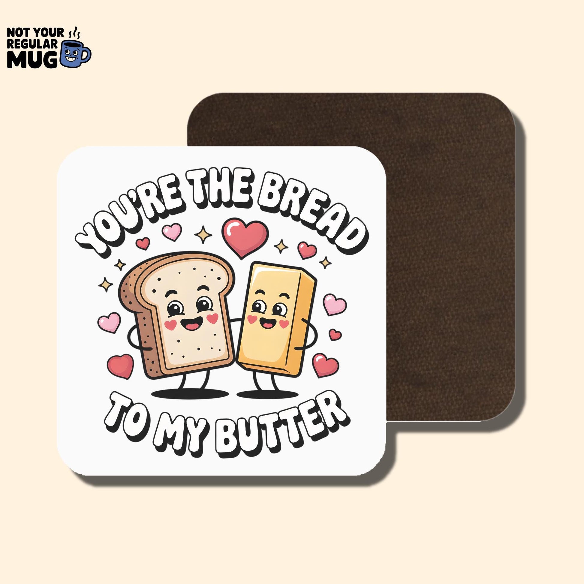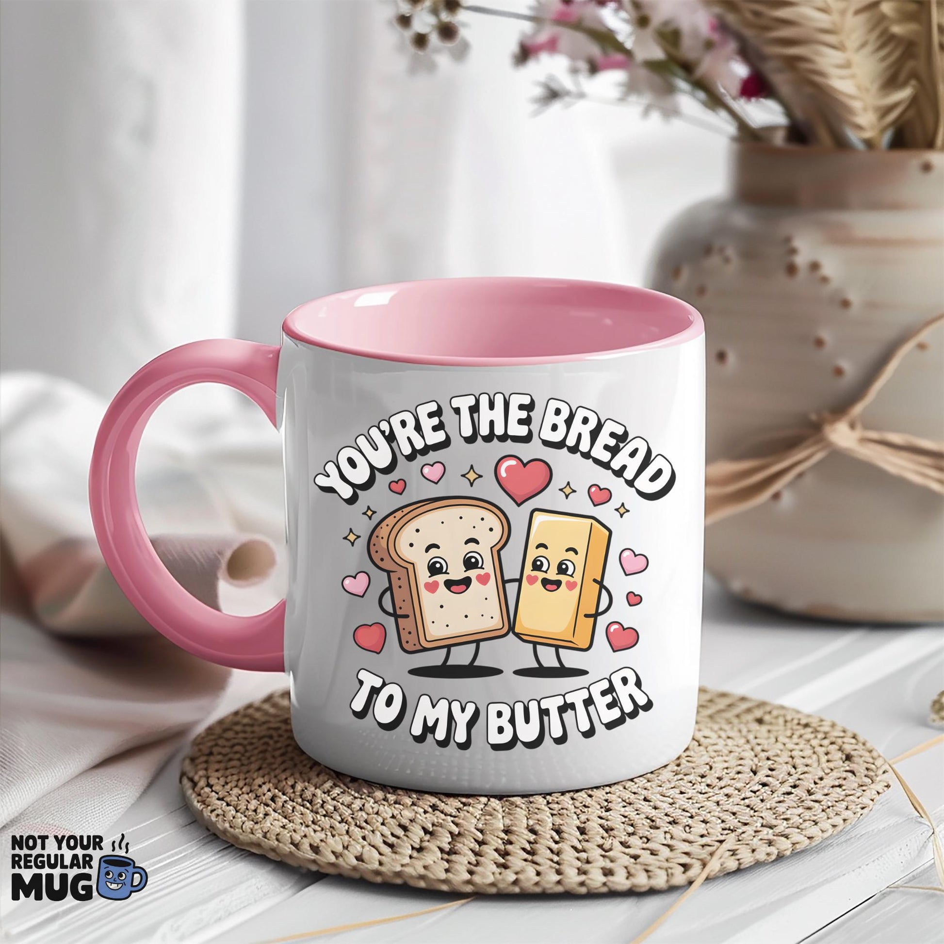 • Funny Valentine’s Day couples mug with “You’re the Bread to My Butter” slogan